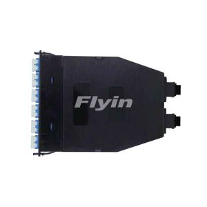 Flyin high-density fiber solution leverages ??4x modular MPO/LC cassettes?? in a rackmount enclosure to convert ??2x MPO-12 single-mode trunk cables?? into ??12x LC Duplex ports??.